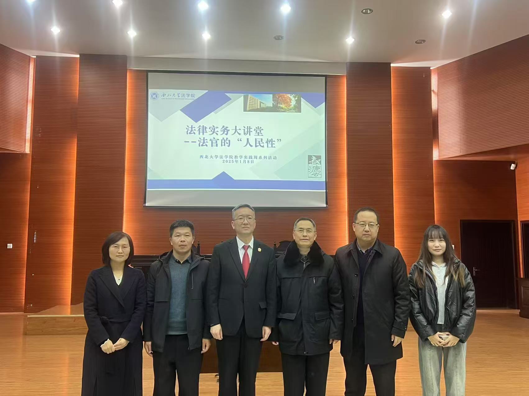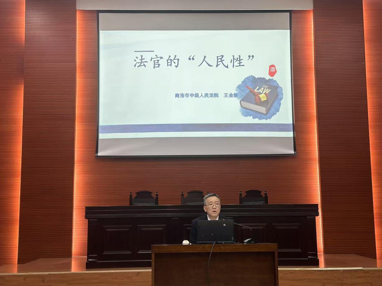 2025年1月8日上午,公司在长安校区模拟法庭成功开展了2024—2025学年第一学期全体本科生实践周活动。商洛市中级人民法院审判委员会委员、民事审判第一庭庭长、四级高级法官王金新受邀,以“法律实务大讲堂——法官的人民性”为主题,为同学们做了一场精彩的讲座。商洛市中级人民法院审判委员会委员张福秦法官、商洛市中级人民法院研究室副主任夏文明法官和商洛市中级人民法院民事审判第一庭书记员石珊珊,学院经理王思锋、教学副经理崔玲玲和2022级、2023级、2024级全体本科生参与此次讲座。本次讲座由教学副经理崔玲玲主持。