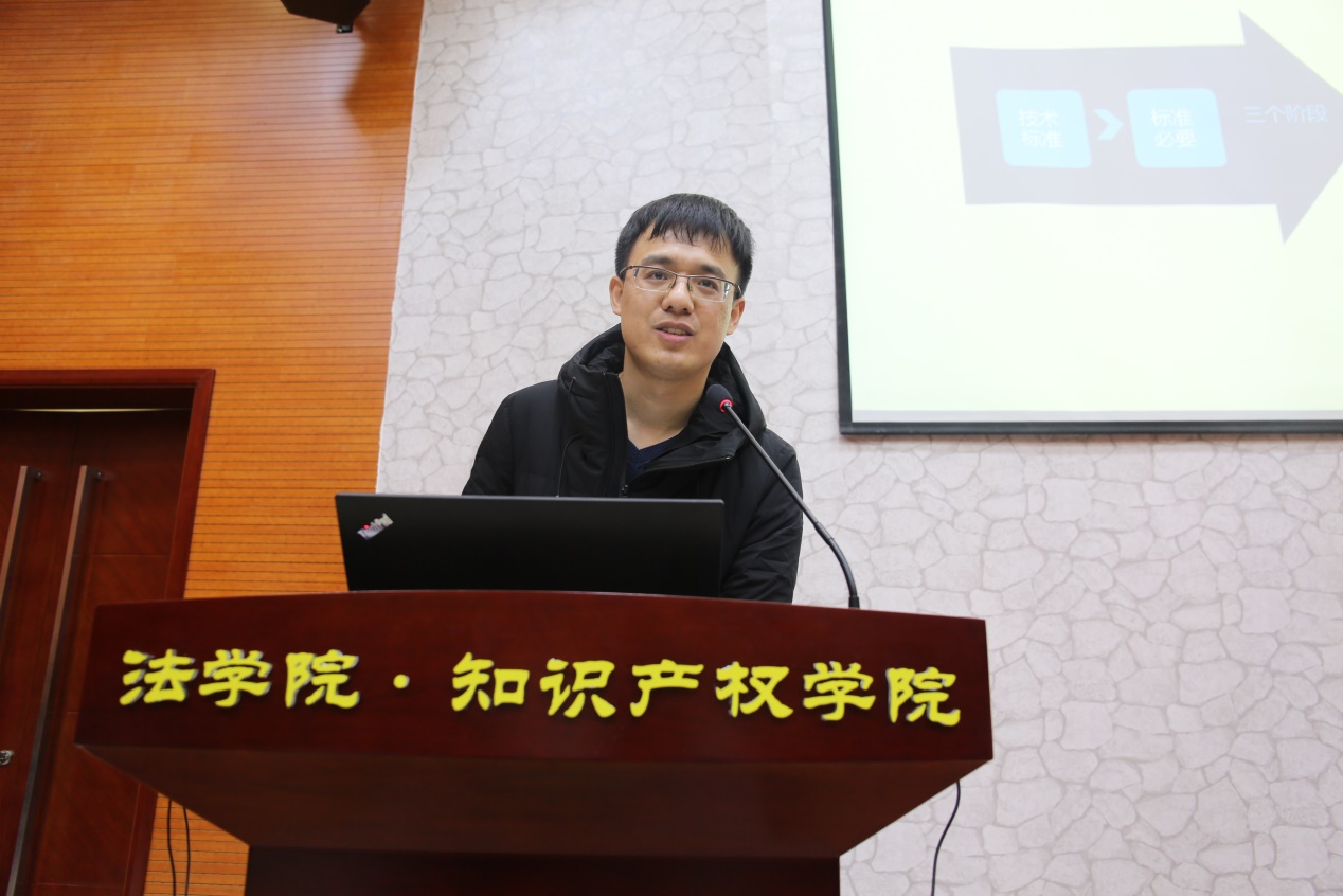 此次交流会分为两个环节,第一个环节是学术报告,第二个环节是互动交流。在学术报告环节,程昭华为现场师生作了题为“技术标准与专利技术冲突的全球观察”的讲座。他首先从华为战略投票的具体例子来引入此次报告的内容,向大家介绍了关于标准、技术标准的相关概念。同时,以三个行业标准与专利的冲突变化作为标准与专利冲突全球观察的视角,即汽车工业时期、通信技术时期与新能源汽车时期。