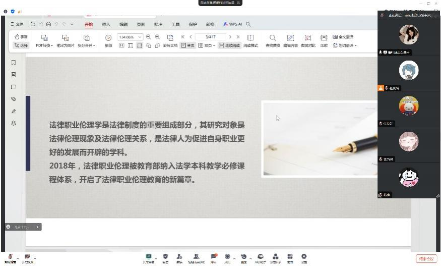 活动首日,班级依托网络平台,由任洋老师开展了一堂充实、深刻的线上课堂教学。老师通过理论讲解、案例分析以及互动问答等方式,深入浅出地阐述了法律职业伦理的核心要素和重要意义。同学们积极参与讨论,纷纷表示这次学习不仅拓宽了知识面,更激发了他们对法律职业伦理的深刻思考。