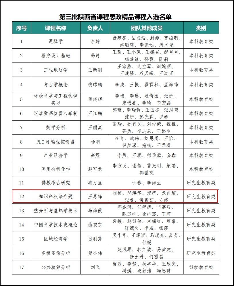 近日,陕西省教育厅公布第三批陕西省课程思政精品课程认定结果,王思锋教授负责的《知识产权法专题》入选省级课程思政精品课程和教学团队。