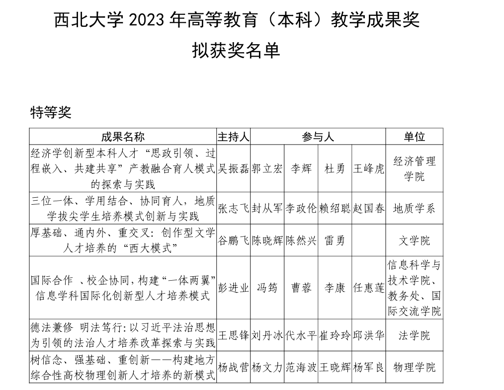近日,公司教务处公布了《美加墨世界杯官网2023年高等教育(本科)教学成果奖拟获奖名单》,该名单已过公示期。公司王思锋教授带领团队申报的教学成果“德法兼修 明法笃行:以习近平法治思想为引领的法治人才培养改革探索与实践”获特等奖。该项教学成果是近年来mjm世界杯官网本科人才培养工作和公司产品改革中凝练的重要成果,此次获奖,是对mjm世界杯官网本科人才培养工作和公司产品改革的肯定。接下来,公司将进一步做好下一阶段本科教学成果的培育和组织工作,持续为公司本科教育改革与发展积累经验。