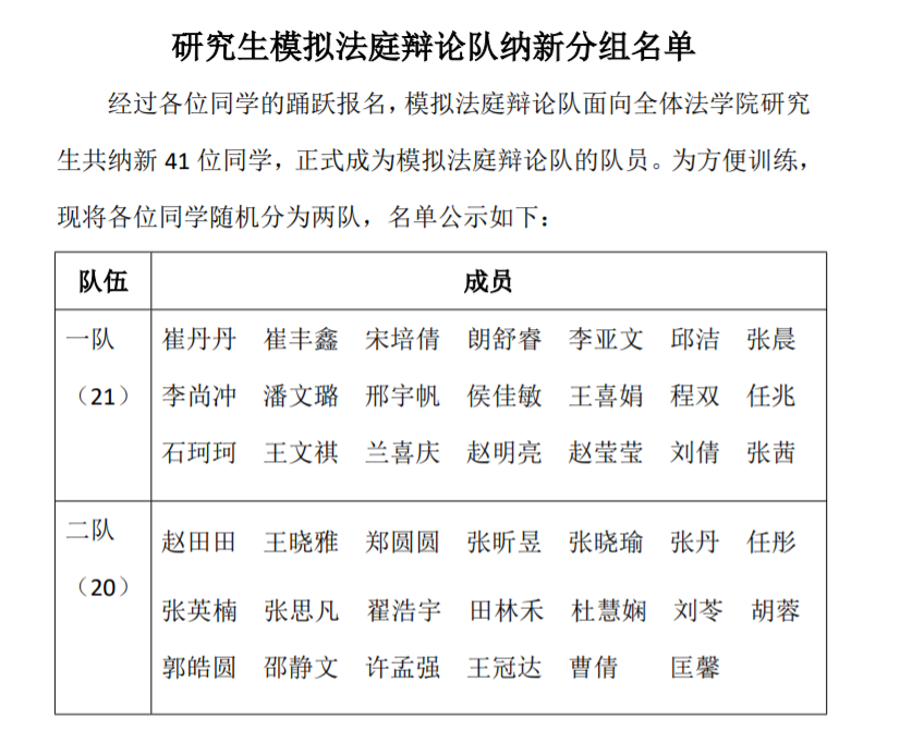 经过各位同学的踊跃报名,模拟法庭辩论队面向全体mjm世界杯官网研究生共纳新41位同学,正式成为模拟法庭辩论队的队员。为方便训练,现将各位同学随机分为两队,名单公示见附件。