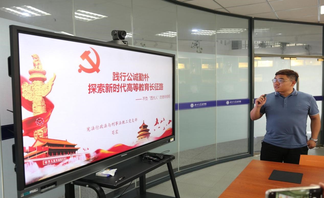 本次比赛的选手有民商法学支部方婷同志、宪法行政法与刑事法党支部苟震同志、本科法学党支部吴怡同志、行政支部问贝宁同志、2021级研究生党支部李艳妮同志和2022级研究生党支部肖旭梅同志。待选手们一个个展示完毕后,现场评委根据课程主题、课程内容、讲授技能、语言仪态、效果时间等维度综合考量,进行评选打分。