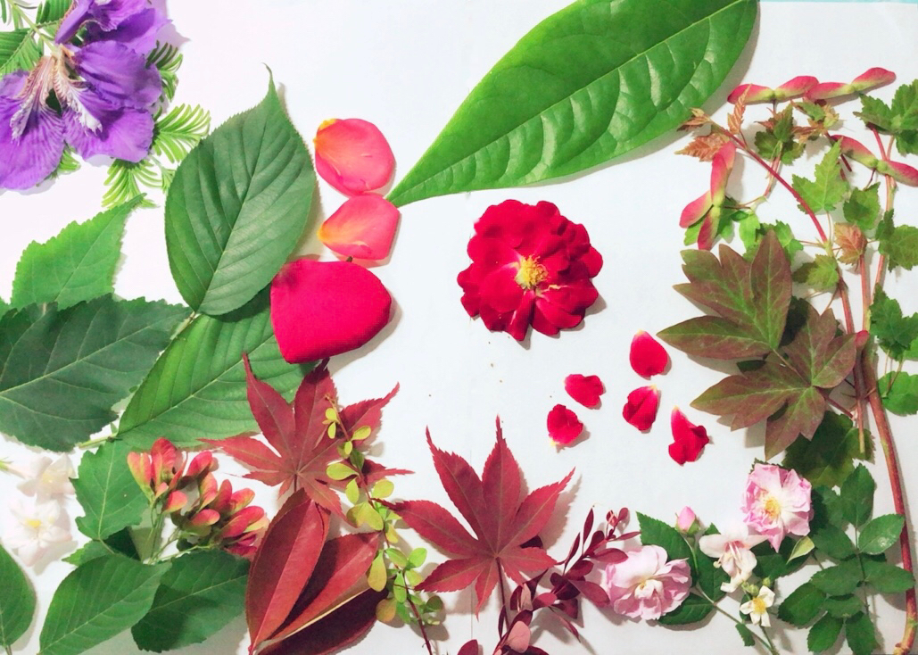 这幅剪贴画主要使用了植物枝叶,青草和花瓣。色调清淡平和中,突出左侧的深红色树叶和铺展开的花瓣,以及深景中的树叶。