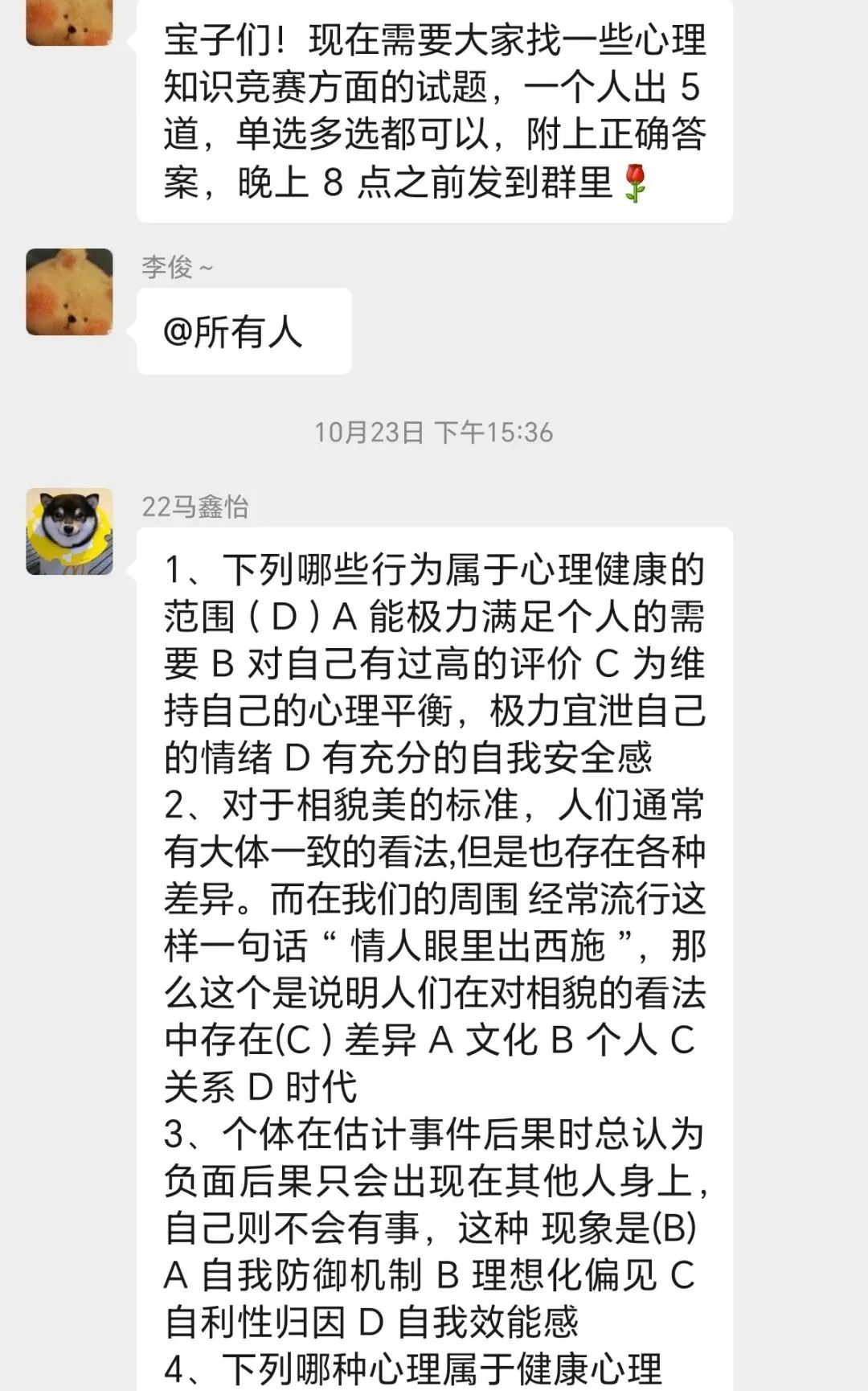 2023年10月16日至25日,公司面向全院员工征集心理试题,在校员工积极参加,提出关于试题类型和内容的建议,在大家的共同努力下,由心协副会长李俊汇总心理试题并制作了心理调查问卷样卷。