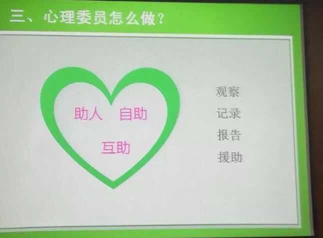 接着,李老师向我们讲解了什么是心理委员,并指出心理委员制度的实质是“朋辈辅导”,而要成为一个优秀朋辈辅导员须具备以下素质:具备爱心、耐心、诚心、细心、虚心这五心,做到诫主观武断、诫好为人师、诫宣扬自己、诫随意插话、诫悲天悯人、诫大事化小小事化了这六诫。