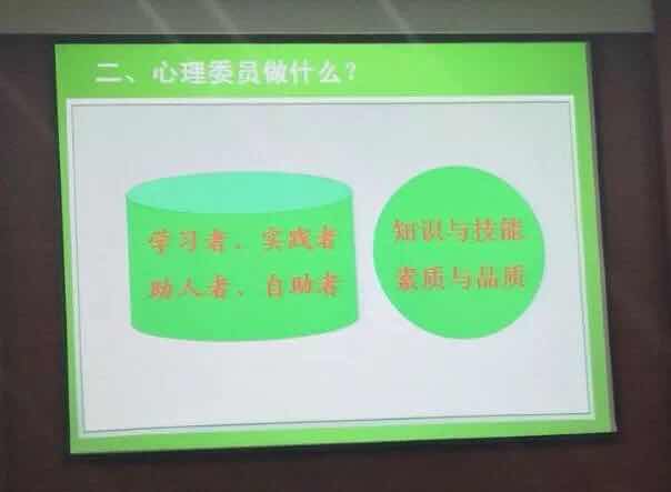 随后,李老师又向我们讲解了心理委员要做什么:做一个学习者、实践者、助人者、自助者,努力提升知识水平和技能。她为我们介绍了心理委员的培训目标和培训大纲,向我们推荐了全国高校心理委员平台MOOC学习平台,并介绍了公司心理委员的考核和评估。