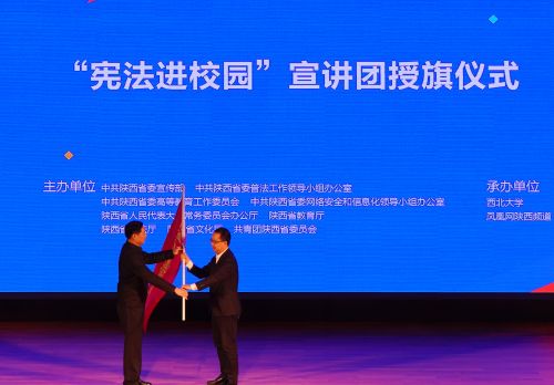 副省长、省委普法工作领导小组副组长胡明朗为“宪法进校园”宣讲团授旗