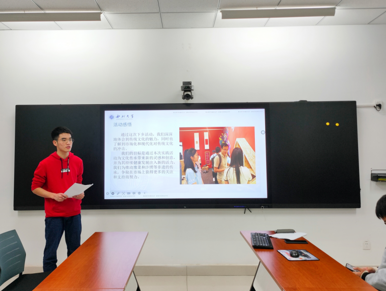 武一卓同学分享了团队前往河南开封豫菜文化研究会、宋绣艺术博物馆、鼓楼区文旅局、开封市博物馆参观学习的经历。团队通过实地考察和专家座谈会的方法,充分了解和掌握了豫菜和汴绣等文遗项目以及开封文旅产业的发展现状,利用SWOT模型进行分析,总结调研成果。团队通过这次下乡活动,了解到市场化和现代化对传统文化的冲击,希望通过本次实践活动为非遗的传承贡献一份力。