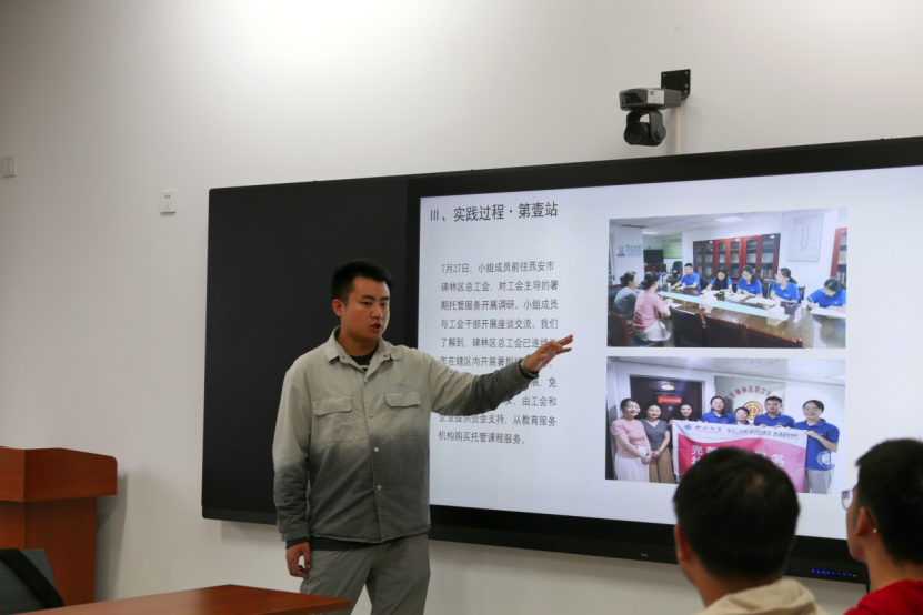 郭富祥同学从选题背景、实践规划、实践过程、实践成果、实践感悟这五个方面给大家展开了详细介绍。团队前往西安市碑林区总工会、咸阳市泾阳县教育局、济南市章丘区团委三地,分别对暑期托管工会主导、政府主导、团委主导三种模式展开调研。在调研过程中,尝试用自己所学的法律知识给当地人员以相关建议,真正将所学用到实处。