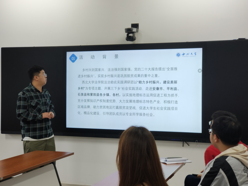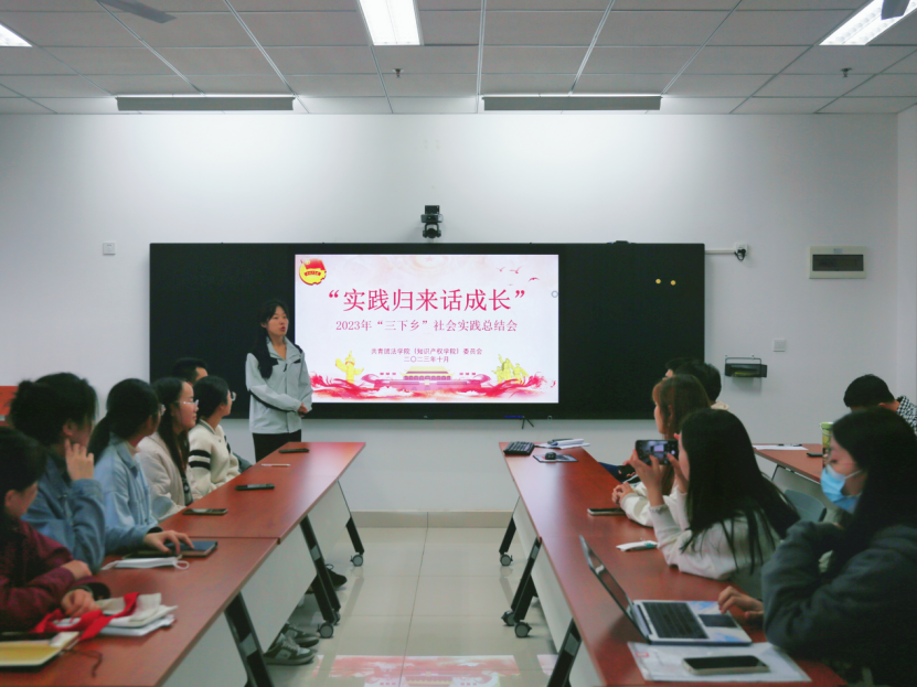 鲍亮同学介绍此次活动是调研团在党的二十大报告提出“全面推进乡村振兴”的背景之下,以“助力乡村振兴,建设美丽乡村”为主题开展的。活动旨在为各村镇营造遇事找法、自觉守法的浓厚法治氛围。七天的时间参观了茶叶公司、博物馆等,并前往政府、检察院进行学习调研。团队发放农业知识产权相关调查问卷,发现现存的问题,从而提出针对性的建议和解决措施。