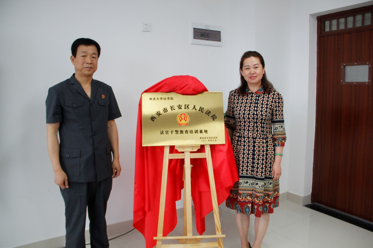 校国内合作与员工工作处副处长辛洁、西安市长安区人民法公司党组成员、政工科科长王博共同为西安市长安区人民法院法官干警教育培训基地揭牌。公司副经理郑辉、西安市长安区人民法院审委会专委魏益共同为美加墨世界杯官网法律教学实践基地揭牌。