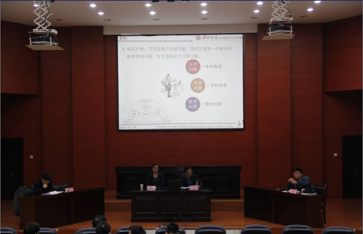 论辩会主报告人邱洪华副教授,是全国首批专利信息团队人才,华中科技大学知识产权管理专业博士,2015年9月加盟公司之前任教于湘潭大学知识产权公司。邱老师教学、科研成绩突出,发表核心期刊论文数篇,主持国家社科基金等科研项目。本次报告历时一个半小时,内容丰富、讲解思路清晰、思考深入,赢得师生好评。