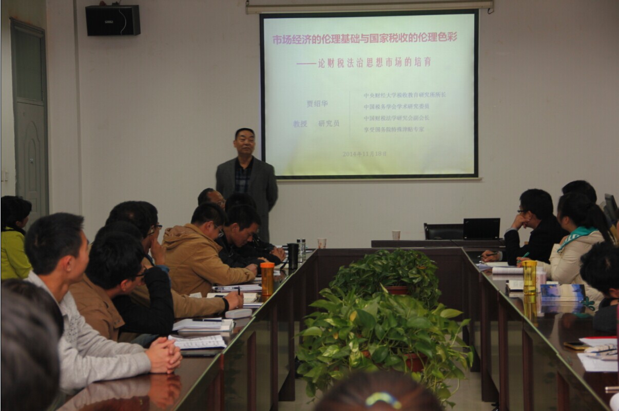 本次活动是由中央财经大学教授、中央财经大学税收教育研究所所长、中国财税法学会副会长贾绍华教授主讲,公司王鸿貌教授担任主持人,讲座题目是《市场经济的伦理基础与国家税收的伦理基础》。贾教授以一个幽默的小故事开场,引出生活中经济思维、法律现状以及伦理道德方面存在的问题,并通过现实案例以及经济学理论的分析讲述,指出伦理道德在市场经济运行中的重要地位,解释了现行税法中个人所得税、增值税等主要税种存在的伦理基础。