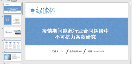 2020年11月7日,由中国法学会能源法学研究会主办、北方工业大学和中国石油大学(华东)承办的第五届全国“绿能杯”高校法学研究生暑期调研竞赛答辩评审暨颁奖仪式圆满落幕,此次调研竞赛的主题为“新冠疫情对能源行业的影响及法律对策研究”,意在引导竞赛师生就新冠疫情背景下管控能源行业法律风险和破解重大法律问题进行深入研究,贡献学术智慧。来自南开大学、上海交通大学和重庆大学等20余所高校的28个参赛项目入围最终评审并进行了线上答辩。线上答辩采取小组方式进行,公司调研组与西安交通大学、上海交通大学和南开大学调研组分到同一小组,组内竞争对手实力强劲。公司调研组成员保持良好心态,精心准备,沉着答辩,迎难而上,圆满完成各项答辩任务,最终脱颖而出,以优异成绩荣获一等奖。张曼副教授荣获本次竞赛优秀指导教师。
