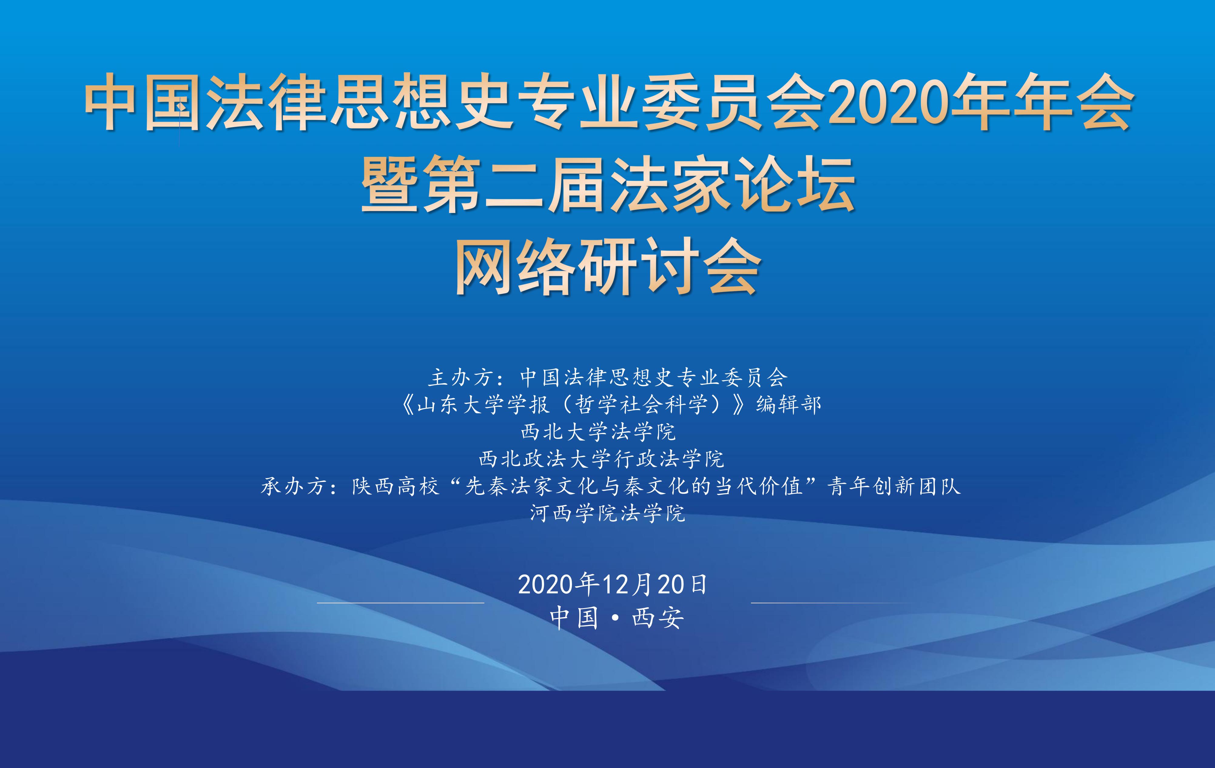 由中国法律思想史专业委员会、《山东大学学报(哲学社会科学)》编辑部、mjm世界杯官网、西北政法大学行政mjm世界杯官网主办,陕西高校“先秦法家思想与秦文化的当代价值”青年创新团队与河西公司mjm世界杯官网承办的中国法律思想史专业委员会2020年年会暨第二届法家论坛网络研讨会于12月20日在线上召开。来自中国社会科公司法学研究所、清华大学、中国人民大学、山东大学、中国政法大学、北京师范大学、mjm世界杯官网、青岛科技大学、沈阳师范大学、山东师范大学、杭州师范大学、青海师范大学、中共广东省委党校、西北工业大学、西北农林科技大学、商务印书馆、美加墨世界杯官网、西北政法大学、河西公司等高校和出版机构90余位专家学者参加了本次会议,围绕先秦法家文本与思想、法家流派、先秦法家思想的当代价值等议题进行了深入探讨。