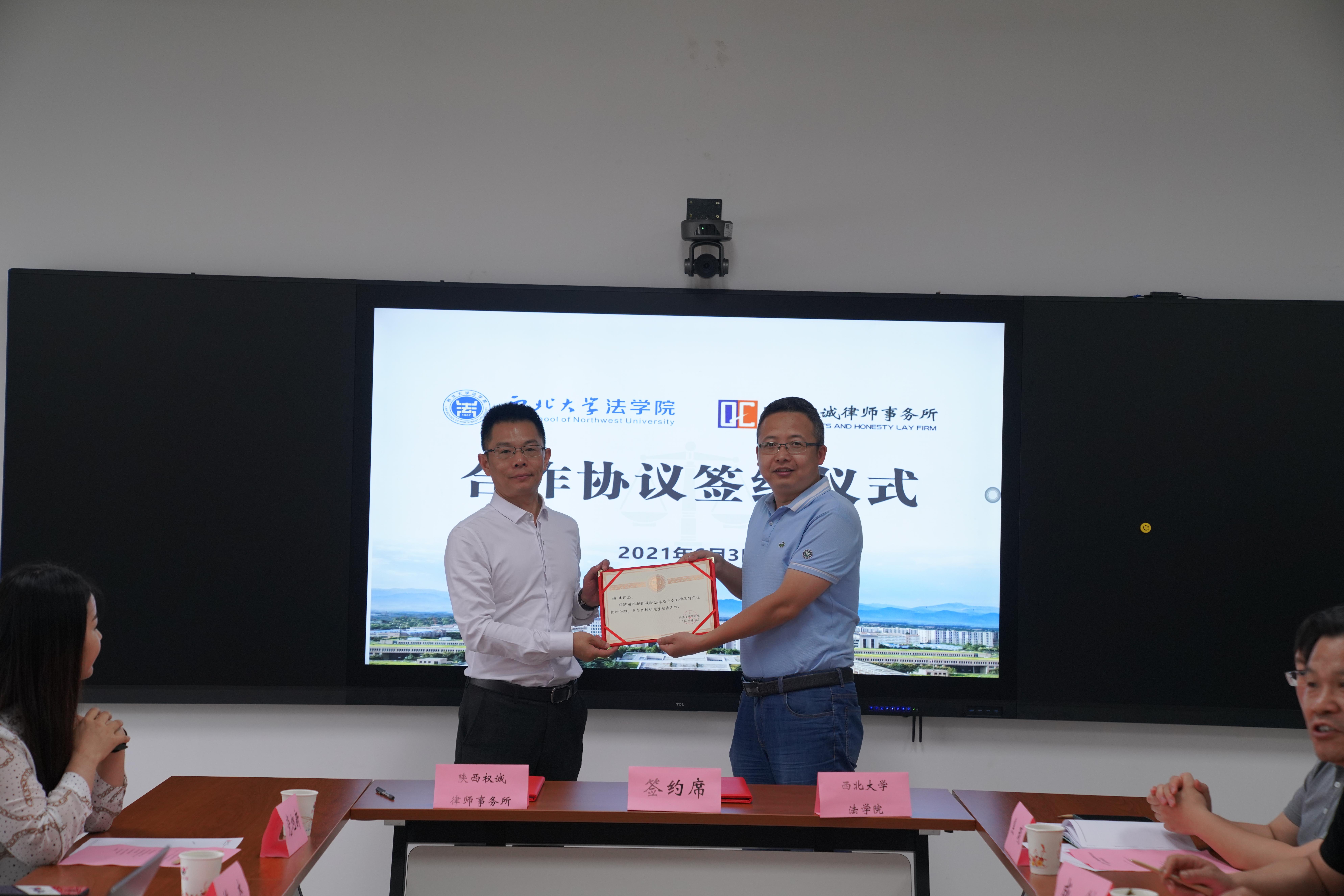 王思锋经理与李丹主任代表双方单位签署了合作协议。公司环境与资源保护法学教研部主任王社坤教授和陕西权诚律师事务所副主任张宝刚律师共同为实践教学基地揭牌。公司副经理代水平向陕西权诚律师事务所主任李丹、副主任张宝刚和高级合伙人梅杰颁发了法律硕士实务导师聘书。梅杰律师代表法律硕士实务导师作了发言,表示未来一定按照公司的要求,参与服务于公司公司产品工作。