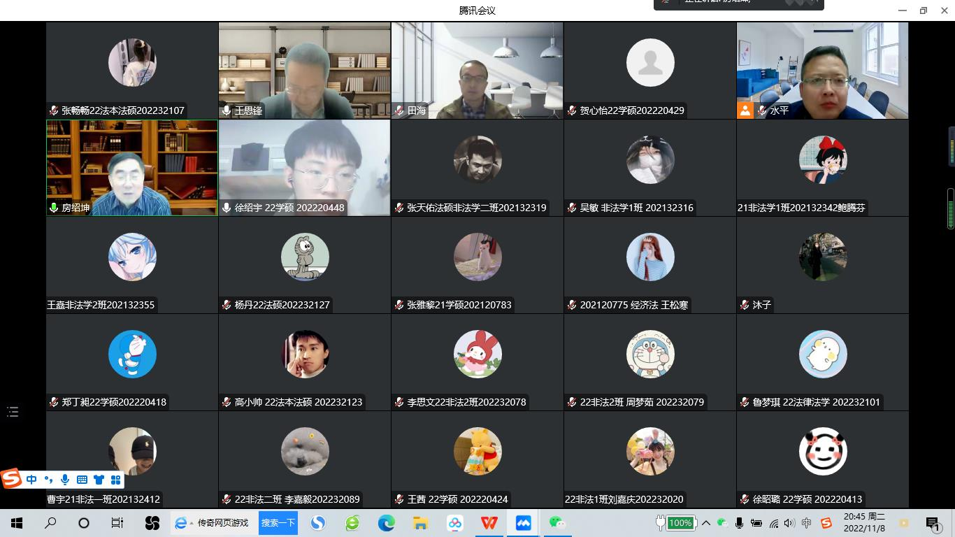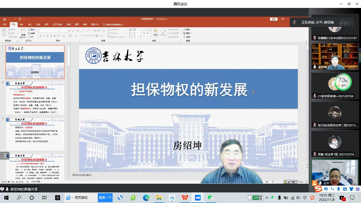 2022年11月8日晚,吉林大学卓越教授,博士生导师,国家级教学名师、新世纪百千万人才工程国家级人选、中宣部“四个一批”人才,教育部高等公司法学类专业教学指导委员会副主任委员,享受国务院政府特殊津贴,原烟台大学董事长房绍坤教授做客公司“侯外庐学术讲座”,为公司师生作了题为“担保物权制度的新发展”的学术讲座。讲座由公司经理王思锋教授主持,代水平副经理、张曼副教授、彭秀坤副教授,李奕霏副教授、田海副教授、涂慧副教授、杜路副教授、傅强博士以及2021级、2022级硕士研究生220余人参加了此次讲座。