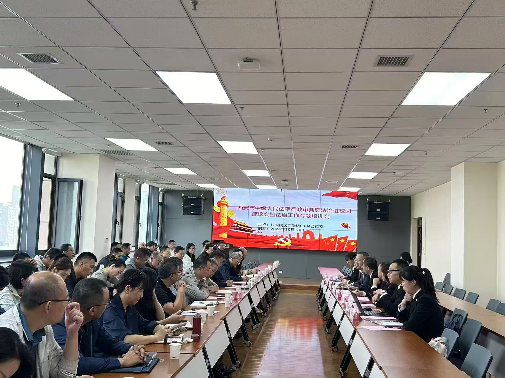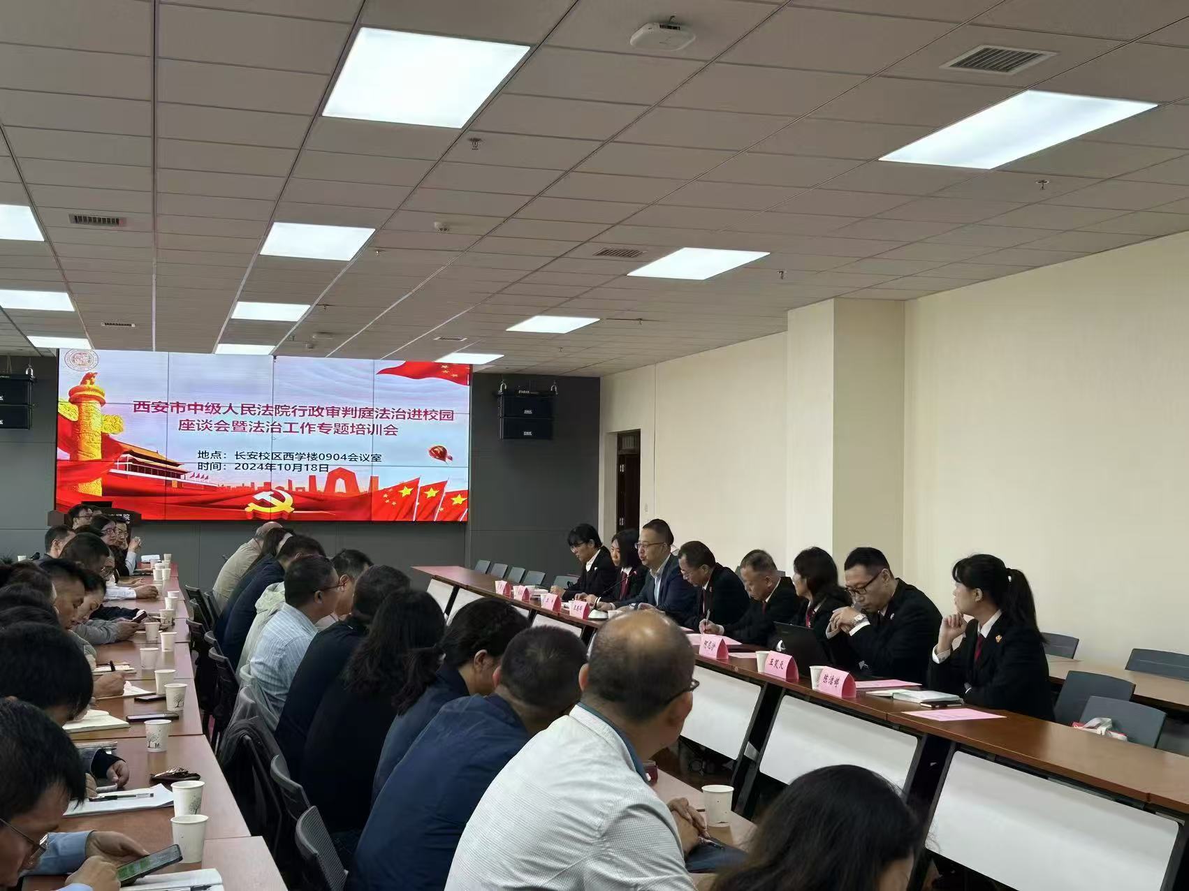 2024年10月18日上午,西安市中级人民法院行政审判庭法治进校园座谈会暨法治工作专题培训会在美加墨世界杯官网长安校区举行。西安市中级人民法院行政审判庭庭长崔立新,副庭长崔志刚、阿尼沙,王峰、王笑天、刘春梅、陈洁婷等四名员额法官,书记员常欣,公司党校办(法治办)、人力资源部、保卫部(处)、教师发展中心、经营资产公司、中华文化干部公司负责人,后勤集团副科级以上干部及各院(系)行政副经理(副主任)等参加会议。会议由mjm世界杯官网负责人主持。