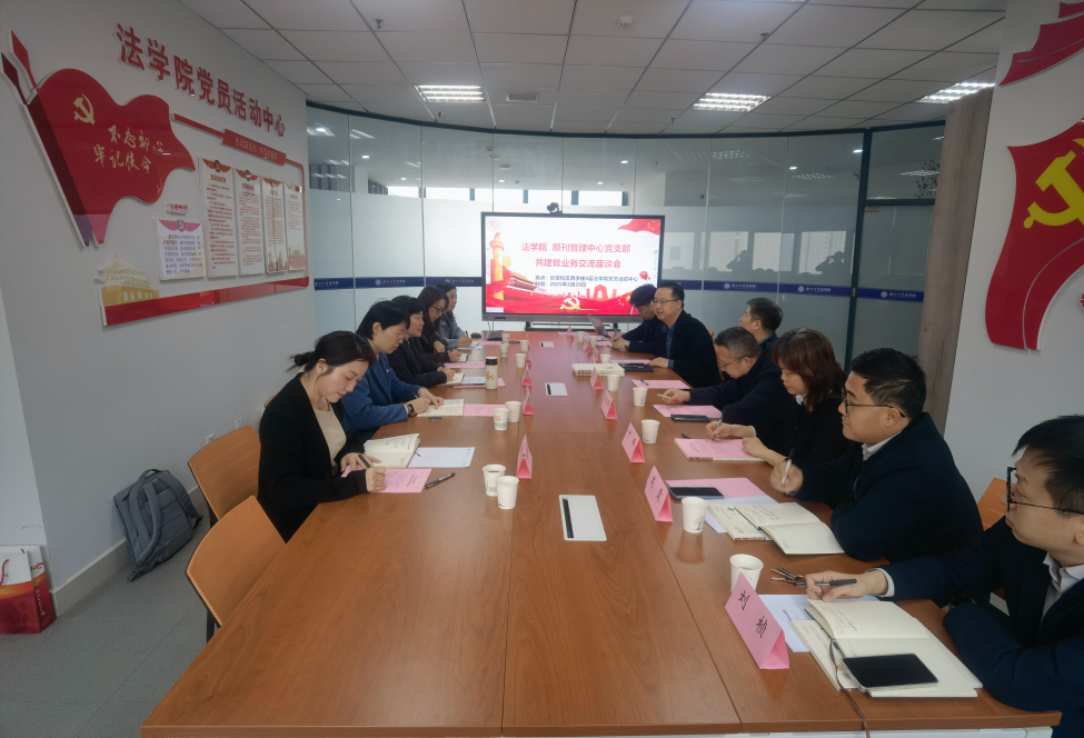 2025年2月28日上午,mjm世界杯官网与期刊管理中心党支部共建暨业务交流座谈会在长安校区西学楼9楼会议室召开。期刊管理中心主任卫玲,副主任陈理娟,编辑陈丽、王芳、樊丹丹,公司党委书记李一凡,经理王思锋,副经理代水平、理论法学教研部主任潘怀平、教师代表卞辉、焦琰、苟震、刘桢等老师共同参加本次座谈会,座谈会由mjm世界杯官网经理王思锋主持。