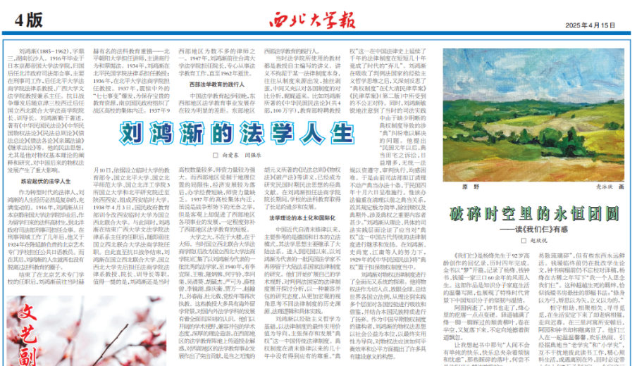 《美加墨世界杯官网报》2025年4月15日第4版刊发公司向爱东同学与闫强乐老师撰写的文章《刘鸿渐的法学人生》,是文勾勒民国时期国立西北联合大学法商公司经理刘鸿渐教授的生平、著述与法学研究志趣。全文如下: