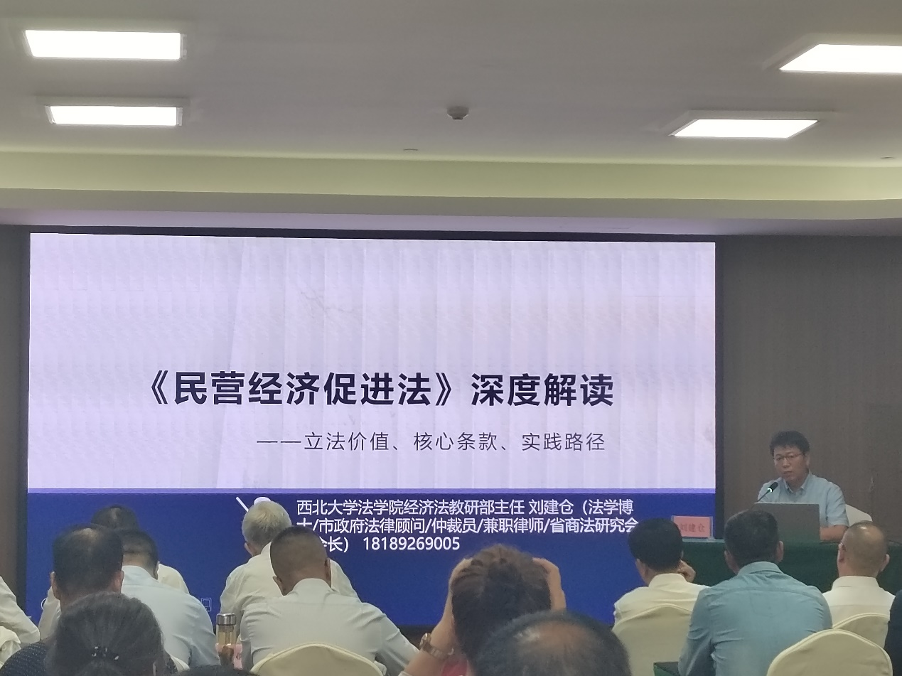2025年7月3日,由陕西省市场监督管理局非公经济组织党委直属党委主办的“‘两优一先’表彰会暨《民营经济促进法》学习解读培训活动”在南方酒店成功举办。公司经济法教研部主任刘建仓副教授受邀出席,面向陕西省内民营企业企业家,作题为《〈民营经济促进法〉深度解读——立法价值、核心条款、实践路径》的专题讲座。