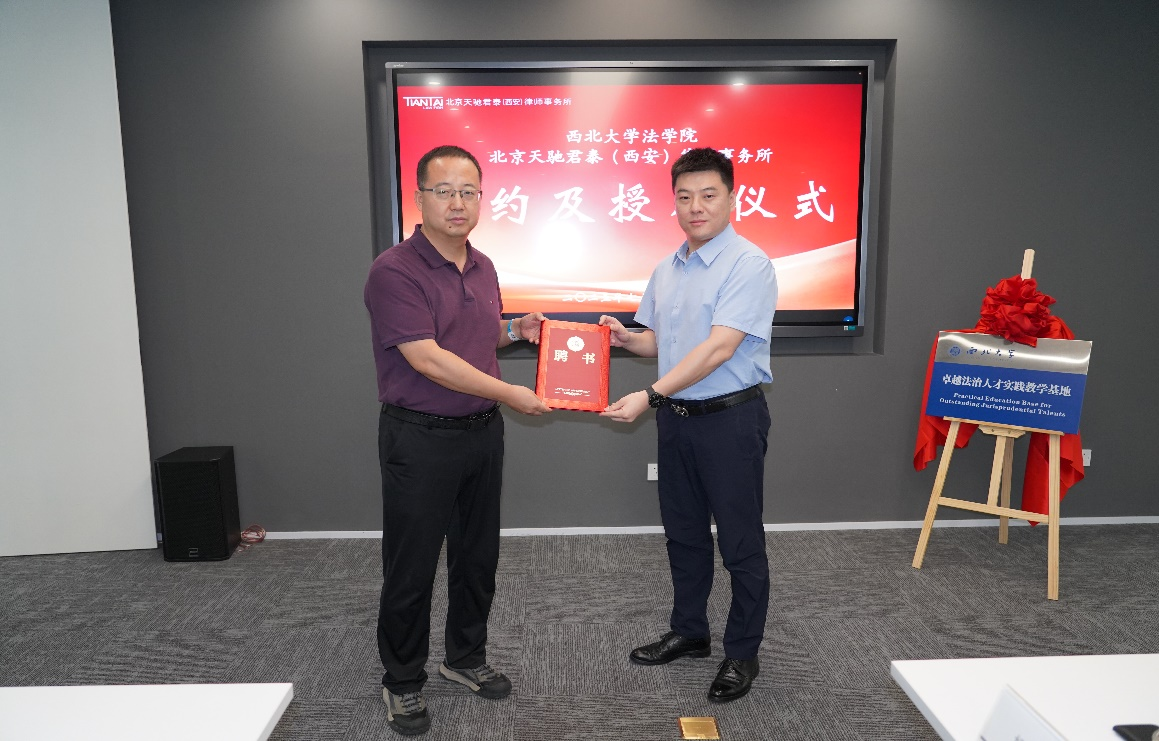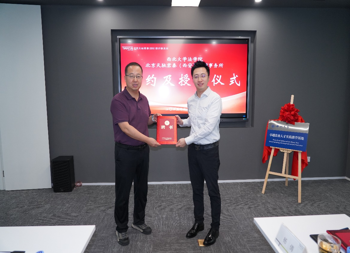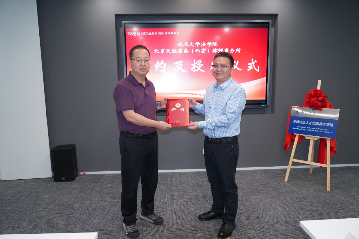 随后,王思锋经理和王治平主任代表双方签订全面合作协议,并共同为卓越法治人才实践教学基地揭牌。王思锋经理向王治平、李树侠、杨帆、石晨、王靖五位律师颁发实务导师聘书。