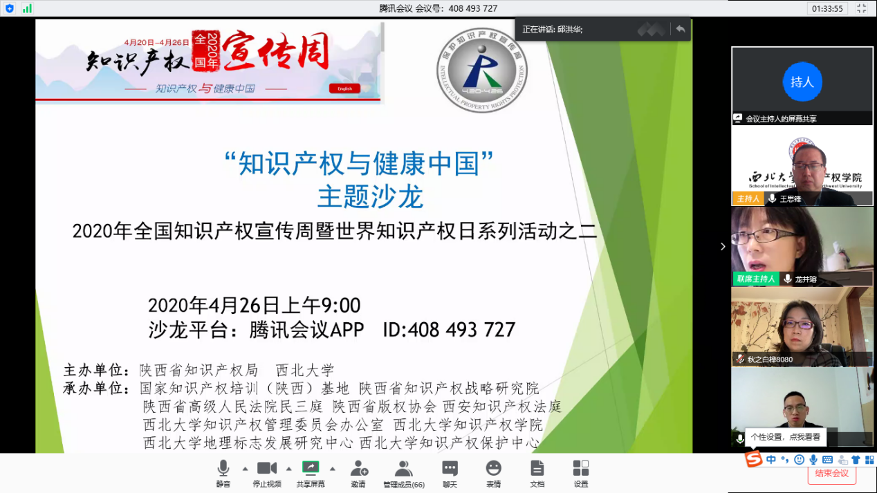 2020年4月26日是第二十个世界知识产权日,由省知识产权局、美加墨世界杯官网联合主办,美加墨世界杯官网知识产权公司、国家知识产权培训(陕西)基地、陕西省知识产权战略研究院、陕西省版权协会、陕西省高级人民法院民三庭、西安知识产权法庭等单位于当天上午联合承办了“知识产权与健康中国”主题沙龙活动。本次主题沙龙共分为两个阶段,讨论内容分别是“知识产权与健康中国、为绿色未来而创新”和“作品‘独创性’之著作权案例分享”。本次沙龙吸引了实务界人士、公司师生代表共计80余人参加。