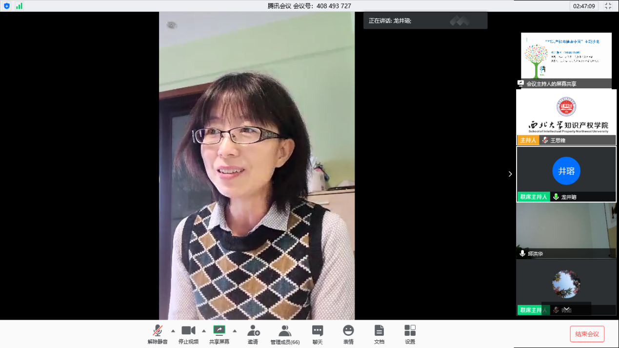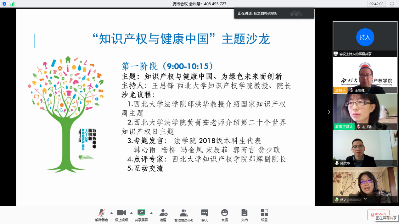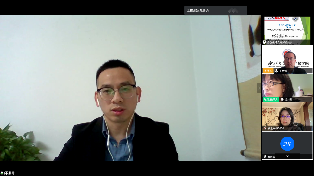 公司经理王思锋教授主持了第一阶段的讨论活动,邱洪华教授、黄菁茹老师以及公司部分员工代表就主题进行发言。邱老师介绍了国家知识产权宣传周“知识产权与健康中国”的主题,强调知识产权在当下疫情期间的重要作用。从激励新药研发、知识产权与公众利益平衡、知识产权国际合作以及知识产权保护等方面阐述了知识产权的重要地位。黄菁茹老师介绍了第二十个世界知识产权日“为绿色未来而创新”的主题,并结合知识产权的学科发展,强调了“知产人”应担负的责任感和使命感,勉励西大学子要更加努力拼搏。