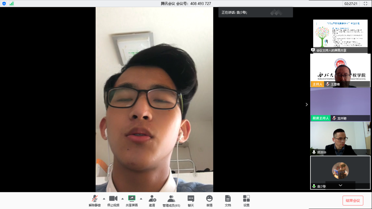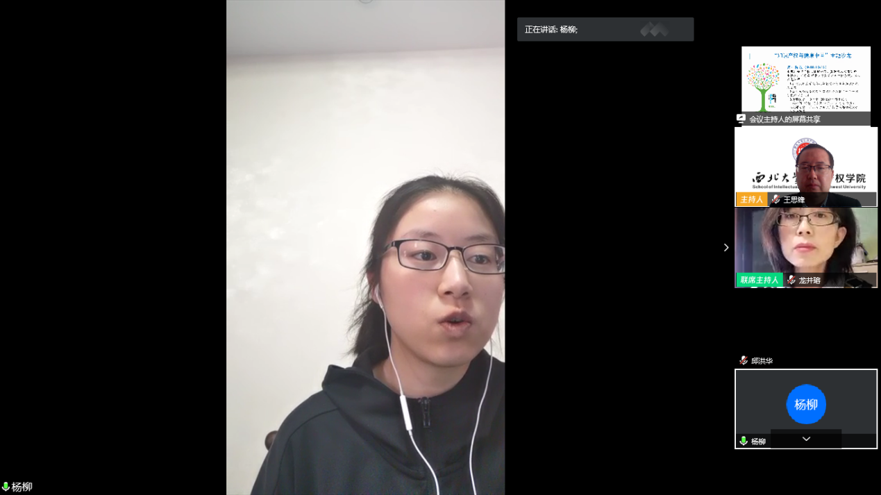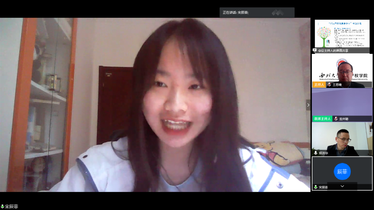 随后,韩心雨、杨柳、冯金凤、宋辰菲、郭芮言、翁少耿等六位同学从知识产权的重要性、当下社会对知识产权的重视程度、时下知识产权案例分析、中医药的知识产权保护等角度阐述了自己对“知识产权与健康中国”主题的理解和感受。