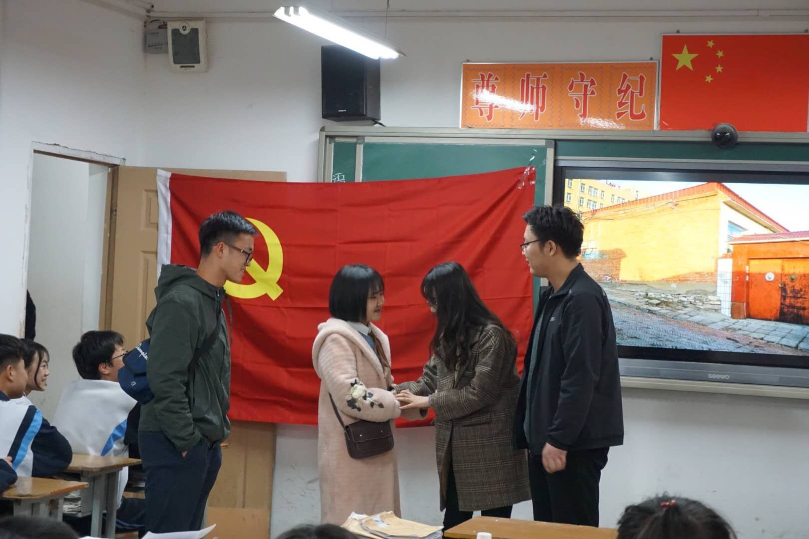 “雷锋精神,红色基因”一张鲜红的幻灯片昭示了此次活动的主题。活动伊始,党小组服务队首先进行了自我介绍,随后向同学们介绍了此行的目的,并通过主持人文字介绍和观看有关雷锋事迹的视频,使在场师生对雷锋事迹有了更加深入的了解,主持人还向大家介绍了雷锋日的来历。同学们认真观看聆听,积极学习雷锋的钉子精神和为人民服务的奉献精神。我们向同学提问了视频中的相关问题,同学们积极回答,现场气氛热烈。