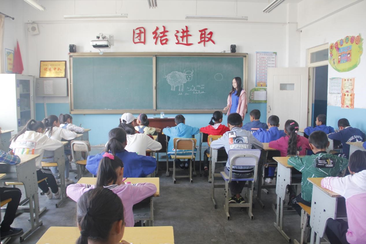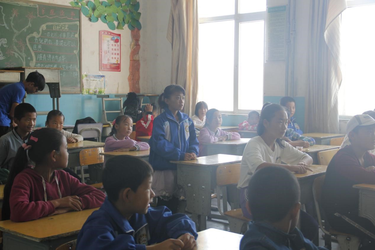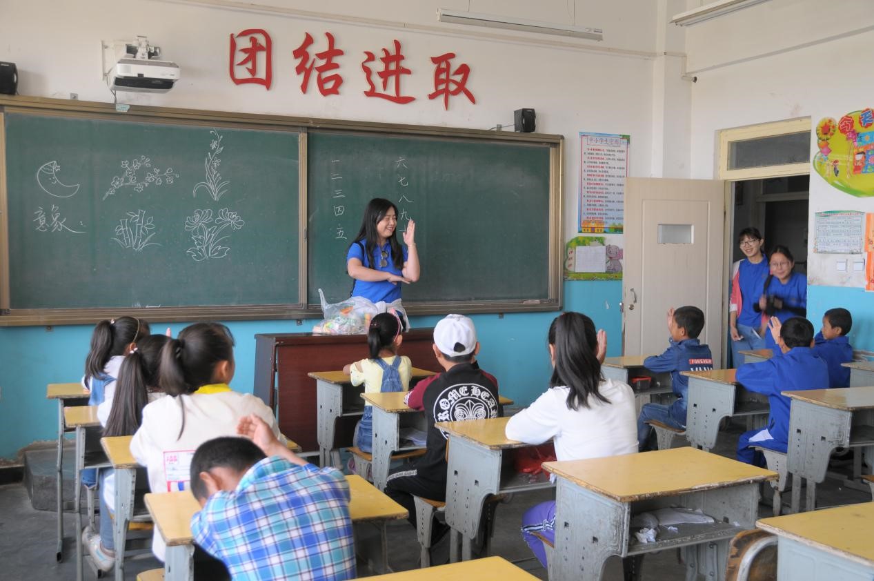 驱车半小时,我们到达了宝库村,热情的村支书带领我们来到了宝库村小学。这里环境整洁,教室里窗明几净,后墙的板报上写着有关“乐在读书”的名言警句,可以看出学习氛围还是很浓的。参加这次活动的同学年龄差距比较大,最小的小朋友刚刚上幼儿园,最大的孩子已经上了初一。之前团队成员进行了充分的准备工作,大家都有分工和认真备课,准备了语文、英语、美术及体育等课程,其中不乏很多有趣的互动交流。上课开始后,小朋友们由一开始的胆怯、害羞,变为后来积极主动回答老师的提问,现场气氛变得越来越热烈。