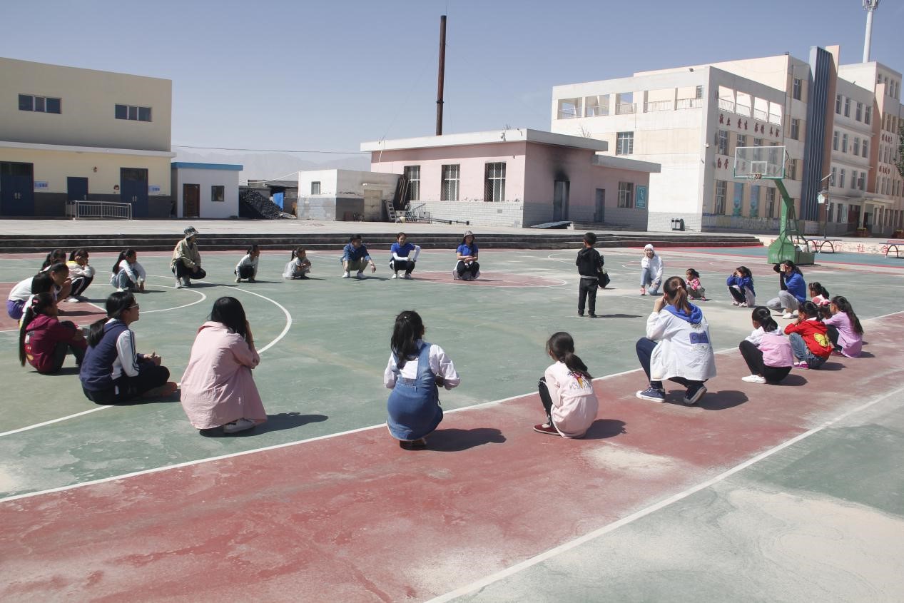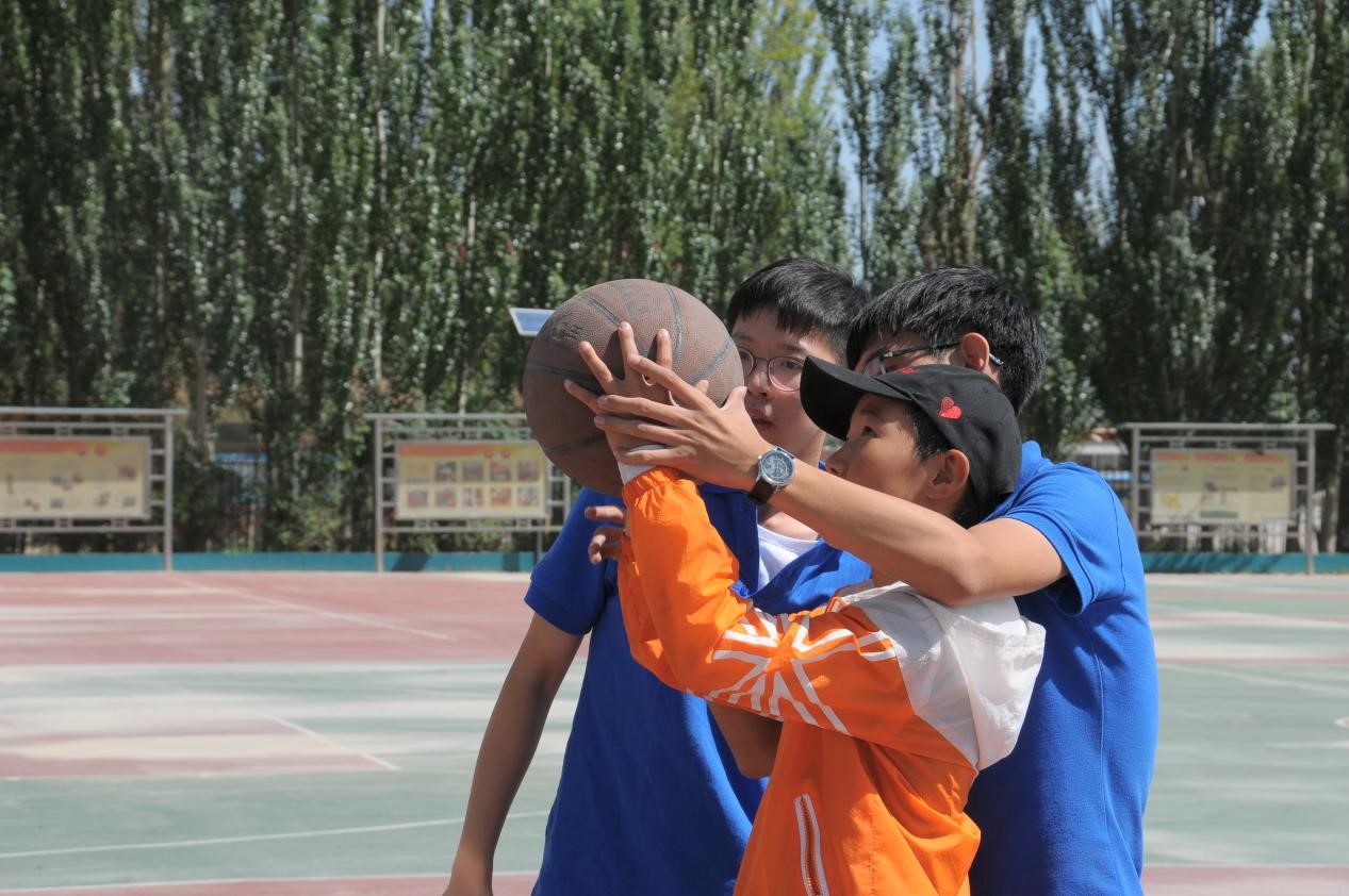体育课上,孩子们按年龄段被分为了两组。一部分在几个老师的带领下练习投篮,另一部分则和老师们一起玩老鹰抓小鸡以及丢手绢的趣味游戏。孩子们欢乐的笑脸衬的格尔木的天空更蓝了。