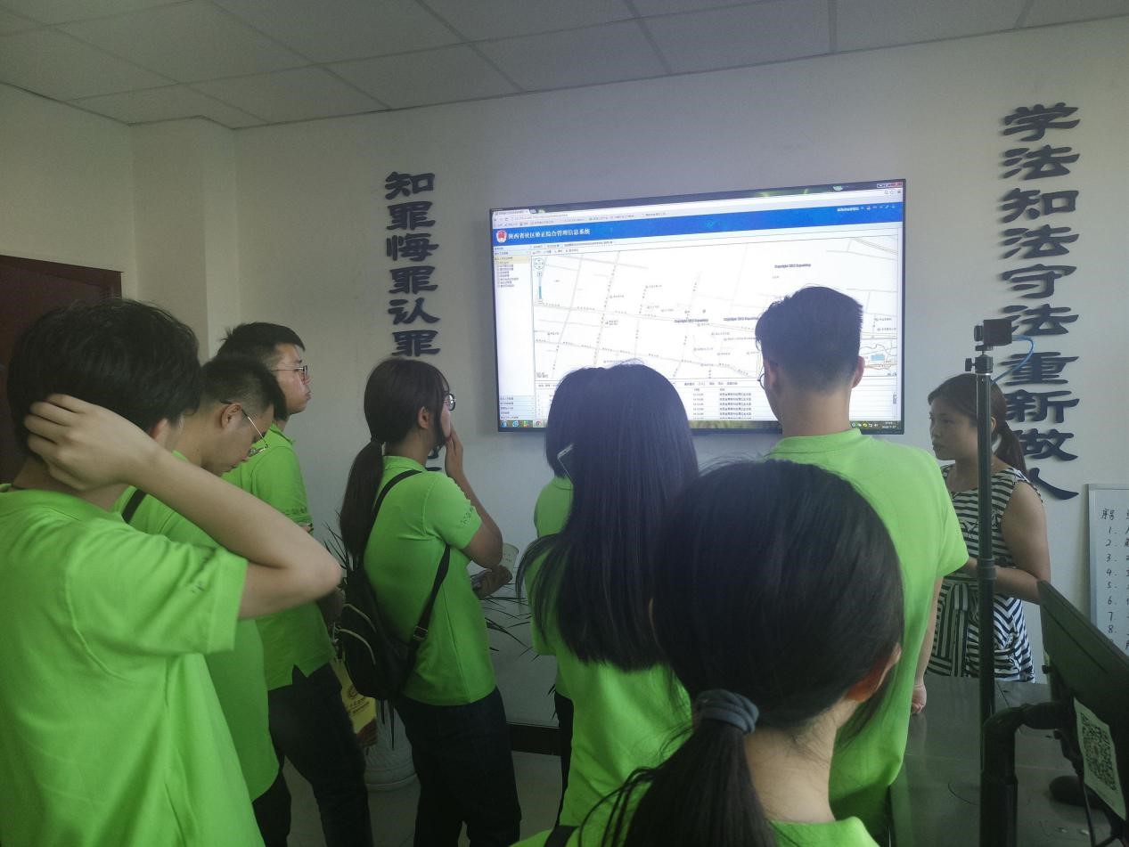 在我们活动接近尾声的时候,实践团一行人在办公室人员的带领下,逐一参观了临渭区司法局的各职能部门。从公律股、宣传股到法律援助中心、基层工作指导股再到社区矫正中心。每进一个科室,我们都受到一次震撼,既感叹于现代化设备的先进性,也惊叹于司法基层工作人员的工作素质和能力,刷新了我们对现代化司法工作的认知。社区矫正人员的远程追踪系统、专门针对服刑人员而设置的远程探视系统都令我们大开眼界,获益匪浅。