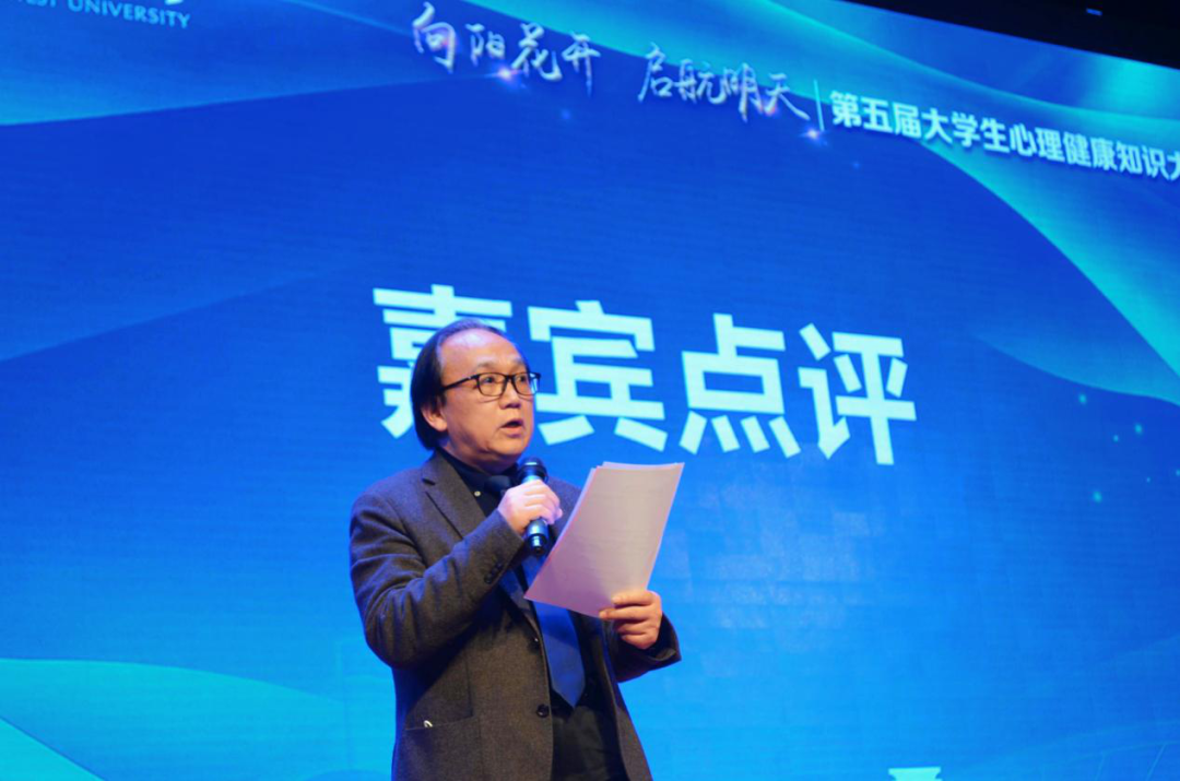 文艺展示结束后进入了嘉宾点评环节。陕西省高校心理素质教育研究会会长郑林科教授对大赛进行了精彩点评,点明了心理知识竞赛的意义,称赞了选手的优秀表现,呼吁同学们热爱心理学,学习心理学、应用心理学,实现心灵的成长。