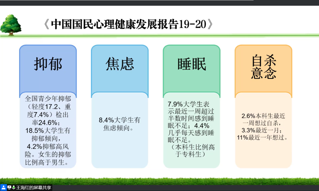 王海红老师主要从老员工心理健康现状、心理问题形成原因、家校协同呵护员工成长三个方面入手进行讲解。展示了多组有关心理健康问题的数据,强调老员工的心理问题不容忽视,孩子上大学后,各位家长应该注重培养孩子的健康身心,健康的身体和心理素质都是顺利完成大学学业的必要前提。并详细介绍了个成长阶段心理状态的变化,家长应当培养、鼓励员工形成每个阶段应有的正确心理。