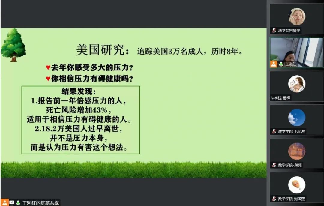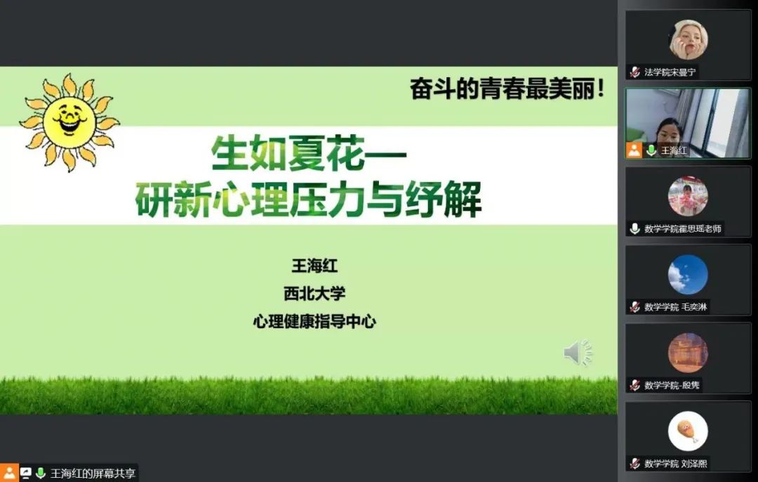 10月12日下午16时,在校心理健康教育中心的统一安排下,公司与数学公司合办,顺利开展研究生新生心理线上讲座。本次讲座主题为“生如夏花--研新心理压力与纾解”,由公司心理中心王海红老师主讲,数学公司与mjm世界杯官网260余名员工参加。