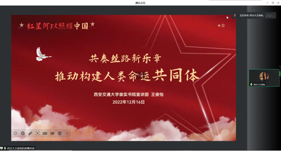 首先,由西安交通大学崇实书院宣讲团王俊怡同学进行题为《共建丝路新乐章,推动构建人类命运共同体》的宣讲,王同学以红星何以照耀中国为引,指出中国不断发展的同时,世界各地仍然存在着饥饿、疾病等重大问题,而中国提出的人类命运共同体思想则是中国贡献给世界的中国智慧和中国方案。她还从自身专业角度切入,结合应用马克思关于共同体的理念“人的本质是人的真正共同体”分析指出,在人类社会不断发展,全球化趋势不断加强的当下,没有哪个国家能够独自应对人类所面临的各种挑战,也没有哪个国家能够退回到自我封闭的孤岛。她提到,人类命运共同体的具体内涵主要包括持久和平、普遍安全、共同繁荣、开放包容和清洁美丽五个方面。
