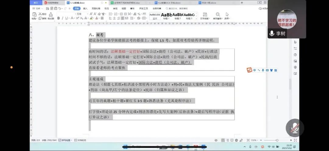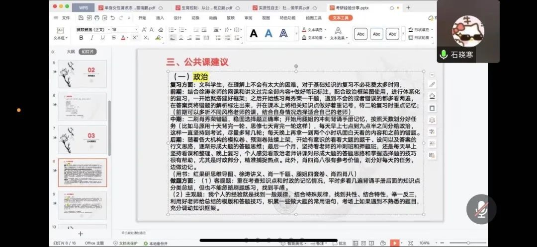 石晓寒学姐首先将法硕和学硕在研究方面,考查形式方面进行了分析与对比,帮助大家更好地选择适合自己的方向。在择校方面,学姐从地方优势、员工资源、未来生活等方面向大家展示了考研择校所需要考虑的一些实际问题,让大家科学合理的找到适合自己的公司。随后学姐也具体讲了政治课、英语课,法学基础和法学综合的备考方法,并向大家推荐了几位老师的课程。最后学姐强调大家应该有良好的备考心态,要合理规划、劳逸结合,不要盲目从众。