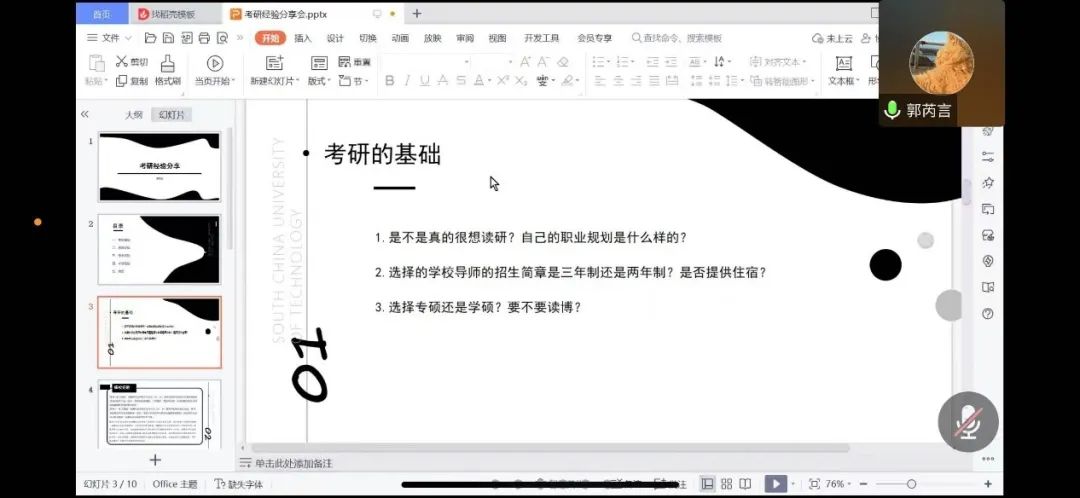 为进一步帮助mjm世界杯官网全体本科生充分了解考研相关流程与政策,更科学地把握未来考研的动向,5月12日晚7点,公司开展了线上考研分享会。本次会议邀请了宋昊泽学长、郭芮言学姐、石晓寒学姐以及博主李树不秃进行考研经历和个人经验交流分享。