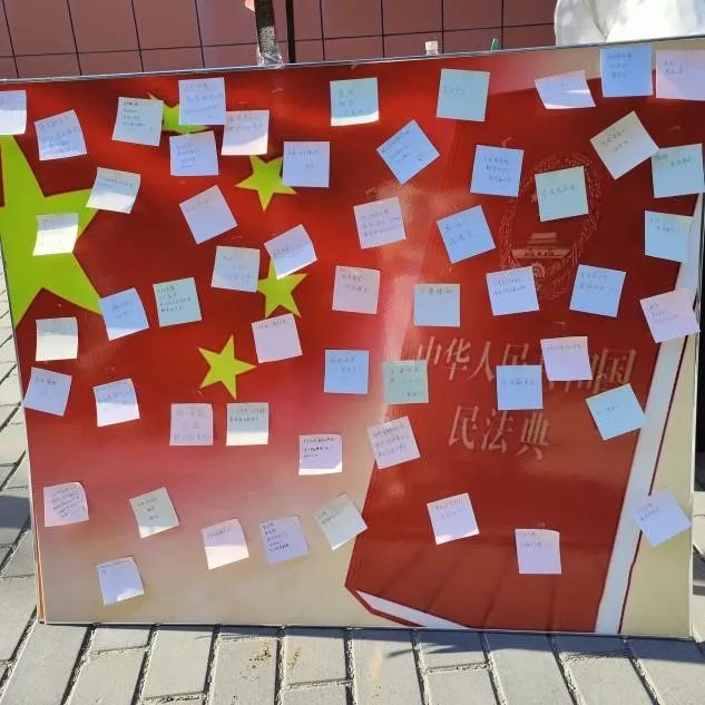 民法典是国家法律体系的重要组成部分,对于维护社会秩序、保护公民权益、促进经济发展具有重要意义。此次活动以写便利贴的形式展开,形式简单灵活,同学们积极参与,踊跃表达自己对民法典的理解和看法。在写便利贴的过程中,思考民法典与每个人生活的密切关系,面对面、零距离普法,助力“典”亮校园,真正做到让老员工潜移默化地接受法律知识的熏陶,营造良好的法治氛围,引导老员工争当新时代法治青少年,扣好人生“第一粒扣子”,“典”亮美好未来!让法律之树在大公司园茁壮生长!