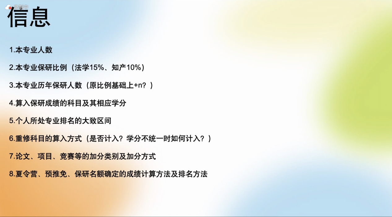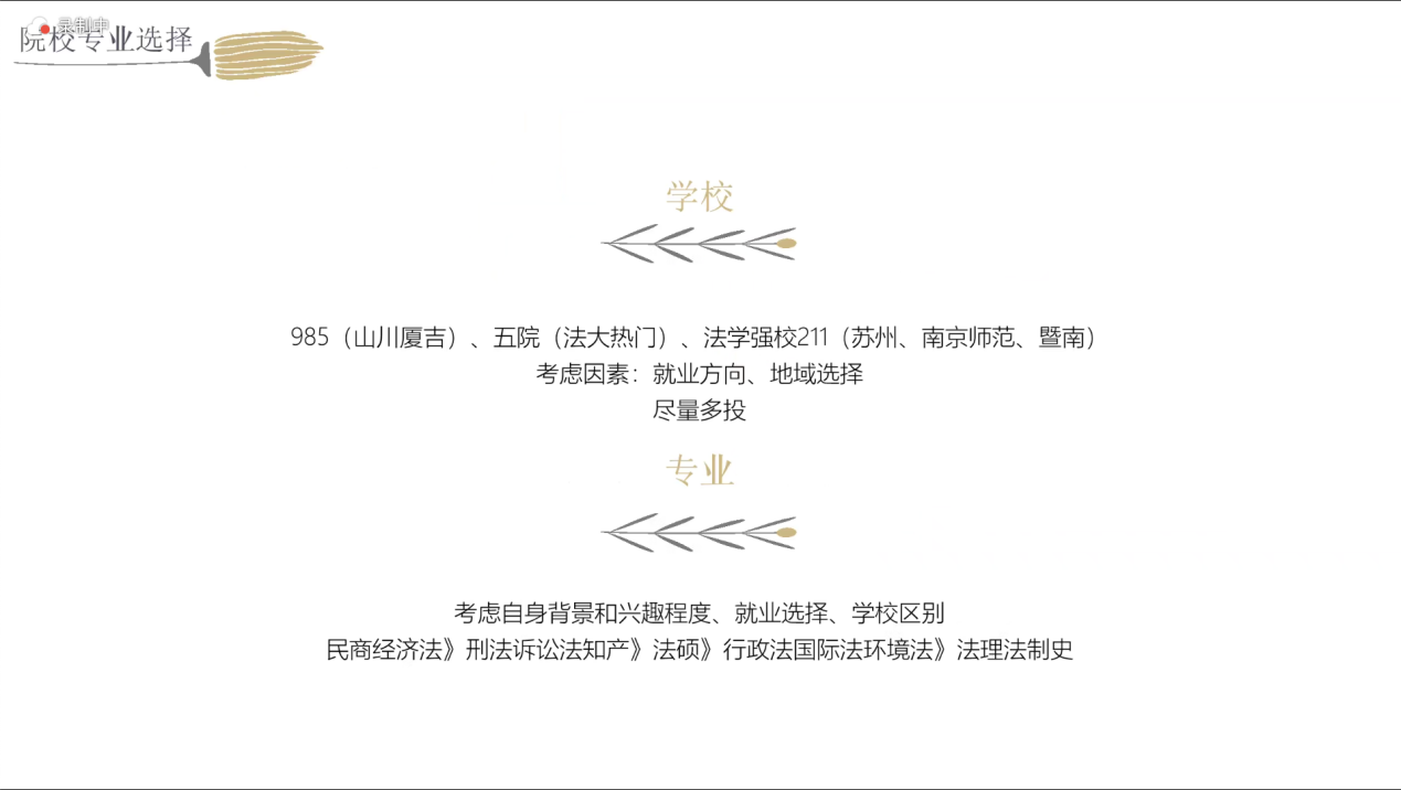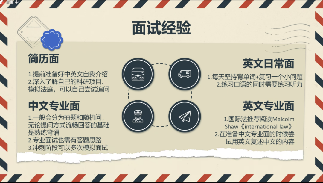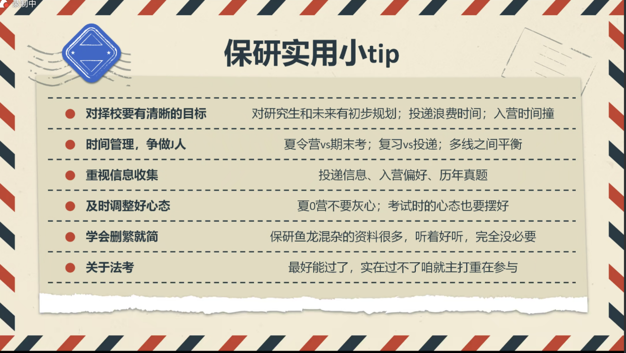 钟雨奇学姐提供了一些保研相关建议与经验,并提醒我们要权衡意向公司学科实力与报考难度。之后列举了一些复习面试的技巧:打破信息差,询问学长学姐,关注相关公众号;扎实基础理论和基础知识,了解热点话题,提高英语水平。最后全面分享了法考的备考经验:从暑假开始复习,重视民商诉一体化,思维导图梳理学科框架等。并且还针对各个科目推荐了自己认为可以高效带领我们备考的老师。