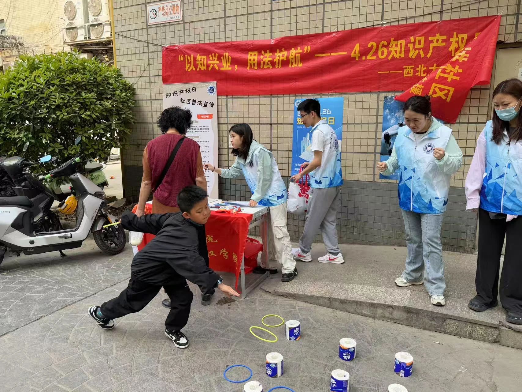 西大法援志愿者设计了“套圈引力场”的趣味游戏,让社区居民们在套圈—答题—获得小奖品的过程中学习法律知识,本次活动将法律小问题与实践案例相联系,把原本枯燥抽象的法律知识变得贴合实际,让居民们能够更深刻具体地理解相关内容。