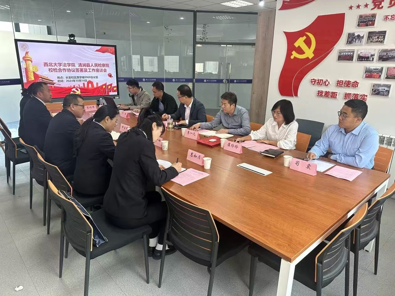 为促进法治人才培养交流,推动法治理论实践与发展,10月14日,清涧县人民检察院检察长郝宝军一行到访公司,并与公司联合举办了检校合作协议签署仪式暨检校合作工作座谈会。清涧县人民检察公司党组书记、检察长郝宝军,党组成员、副检察长周勇,检委会专职委员李娜,政治部主任王清华,办公室主任惠如月,以及公司党委书记李一凡,经理王思锋,副经理代水平、崔玲玲、许博,刑事法学教研部苟震、李国华,团委书记杨霁明等参加了此次签约。
