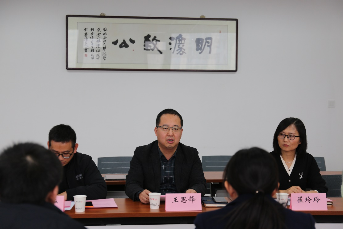 王思锋经理首先对史丽妮副经理一行五人莅临公司交流工作表示欢迎。随后,他介绍了我院的发展历史、团队力量、人才培养制度、团队建设、科学研究以及特色研究方向等情况,尤其详细介绍了公司知识产权专业的建设情况。他提到,目前公司正在不断推进法学教育模式和法治人才培养机制改革,积极与实务部门深入合作,探索协同育人机制,通过课程共建、专业共建、团队共建、队伍共建等,实现校地融合发展,提升人才培养质量。最后,王思锋经理对史丽妮副经理一行莅临公司交流工作再次表示感谢,并希望双方今后在法治人才培养、实践教学以及重点在知识产权保护等领域加强合作,立足新需求、迎接新挑战,共同推进法学理论与实践的融合发展。